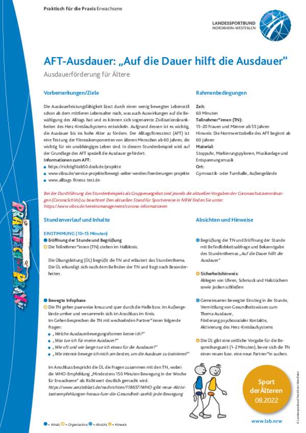 Der Alltagsfitnesstest (AFT) ist eine Testung der Fitnesskomponenten von älteren Menschen ab 60 Jahren, die wichtig für ein unabhängiges Leben sind. In diesem Stundenbeispiel wird auf der Grundlage des AFT speziell die Ausdauer gefördert.