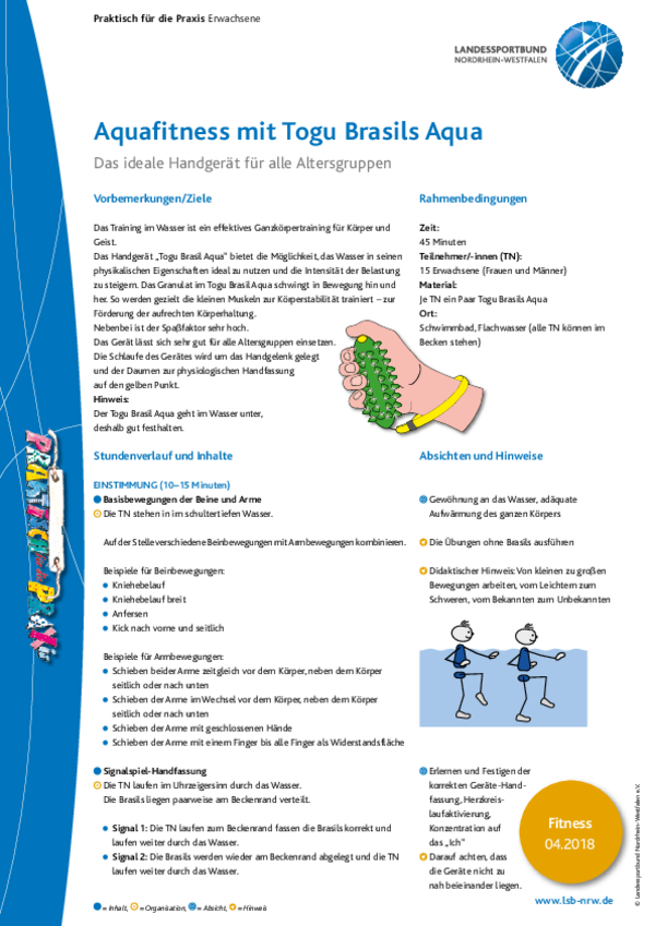 Das Training im Wasser ist ein effektives Ganzkörpertraining für Körper und Geist. Das Handgerät „Togu Brasil Aqua“ bietet die Möglichkeit, das Wasser in seinen physikalischen Eigenschaften ideal zu nutzen und die Intensität der Belastung zu steigern. Das Granulat im Togu Brasil Aqua schwingt in Bewegung hin und her. So werden gezielt die kleinen Muskeln zur Körperstabilität trainiert – zur Förderung der aufrechten Körperhaltung. Nebenbei ist der Spaßfaktor sehr hoch.