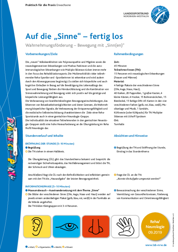 Die „neuen“ Volkskrankheiten wie Polyneuropathie und Migräne sowie die neurodegenerativen Erkrankungen wie Morbus Parkinson und die autoimmunologischen Erkrankungen wie Multiple Sklerose rücken immer mehr in den Focus des Rehabilitationssports. Die Multimorbidität vieler teilnehmender Reha-Sportler und -Sportlerinnen ist erkennbar und wird zudem durch den Alterungsprozess begünstigt. Es stellen sich körperliche und auch kognitive Einbußen in Bezug auf die Bewältigung des Lebensalltags dar. Sport und Bewegung fördern die Hirndurchblutung und die Kombination von Sinneswahrnehmung und Bewegung wirkt sich positiv auf die geistige und körperliche Leistungsfähigkeit aus. Die Verbesserung von krankheitsbedingten Bewegungseinschränkungen, das Erkennen von Belastbarkeitsmöglichkeiten und deren Grenzen, die Wahrnehmung körperlicher Signale, die Verbesserung der Entspannungsfähigkeit und die realistische Selbsteinschätzung charakterisieren die Ziele einer RehaSportstunde auch in einer gemischten Neurologie-Gruppe.