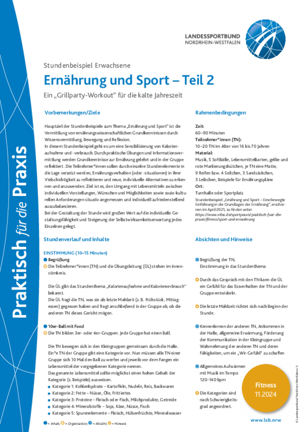 Hauptziel der Stundenbeispiele zum Thema „Ernährung und Sport“ ist die Vermittlung von ernährungswissenschaftlichen Grundkenntnissen durch Wissensvermittlung, Bewegung und Reflexion. In diesem Stundenbeispiel geht es um eine Sensibilisierung von Kalorienaufnahme und -verbrauch. Durch praktische Übungen und Informationsvermittlung werden Grundkenntnisse zur Ernährung gelehrt und in der Gruppe reflektiert.