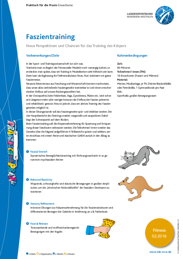 In dieser Übungsstunde soll das Fasziengewebe spür- und erlebbar werden. Die vier Hauptbereiche des Trainings werden vorgestellt und ausprobiert. Dabei liegt der Schwerpunkt auf dem Rücken.