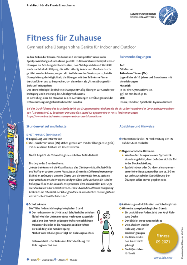 Das Stundenbeispiel beinhaltet schwerpunktmäßig Übungen zur Ganzkörperkräftigung und Förderung des Gleichgewichtssinns.