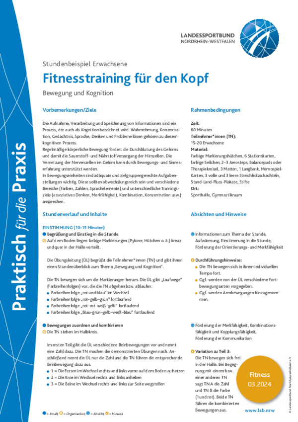 Regelmäßige körperliche Bewegung fördert die Durchblutung des Gehirns und damit die Sauerstoff- und Nährstoffversorgung der Hirnzellen. Die Vernetzung der Nervenzellen im Gehirn kann durch Bewegungs- und Sinneserfahrung unterstützt werden. In Bewegungseinheiten sind adäquate und zielgruppengerechte Aufgabenstellungen wichtig. Diese sollten abwechslungsreich sein und verschiedene Bereiche (Farben, Zahlen, Sprachelemente) und unterschiedliche Trainingsziele (assoziatives Denken, Merkfähigkeit, Kombination, Konzentration usw.) ansprechen.