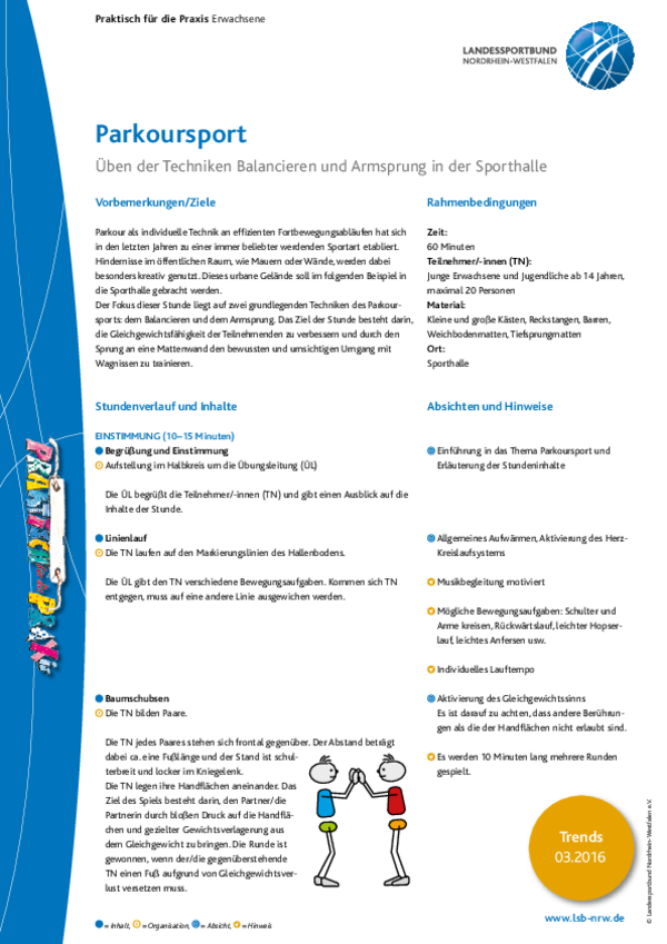 Der Fokus dieser Stunde liegt auf zwei grundlegenden Techniken des Parkoursports: dem Balancieren und dem Armsprung. Das Ziel der Stunde besteht darin, die Gleichgewichtsfähigkeit der Teilnehmenden zu verbessern und durch den Sprung an eine Mattenwand den bewussten und umsichtigen Umgang mit Wagnissen zu trainieren.
