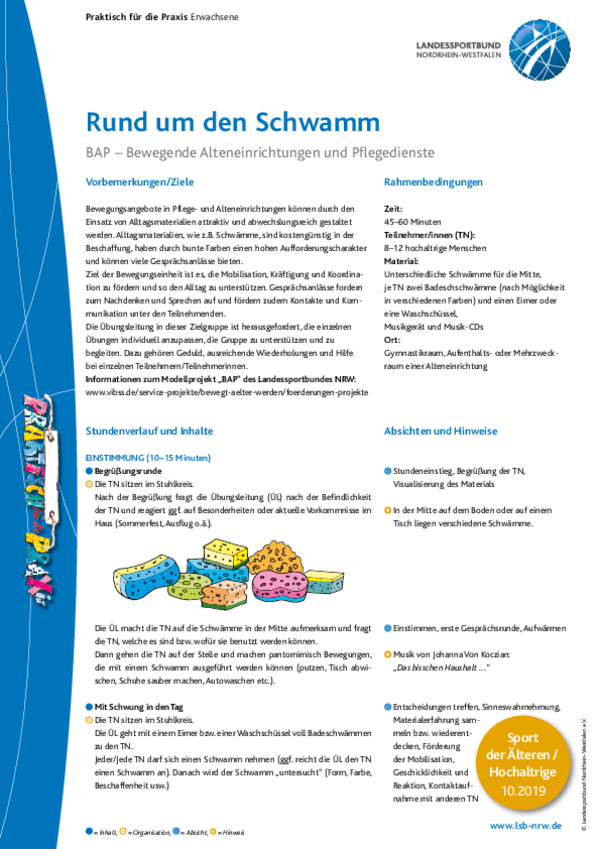 Bewegungsangebote in Pflege- und Alteneinrichtungen können durch den Einsatz von Alltagsmaterialien attraktiv und abwechslungsreich gestaltet werden. Alltagsmaterialien, wie z.B. Schwämme, sind kostengünstig in der Beschaffung, haben durch bunte Farben einen hohen Aufforderungscharakter und können viele Gesprächsanlässe bieten. Ziel der Bewegungseinheit ist es, die Mobilisation, Kräftigung und Koordination zu fördern und so den Alltag zu unterstützen. Gesprächsanlässe fordern zum Nachdenken und Sprechen auf und fördern zudem Kontakte und Kommunikation unter den Teilnehmenden.