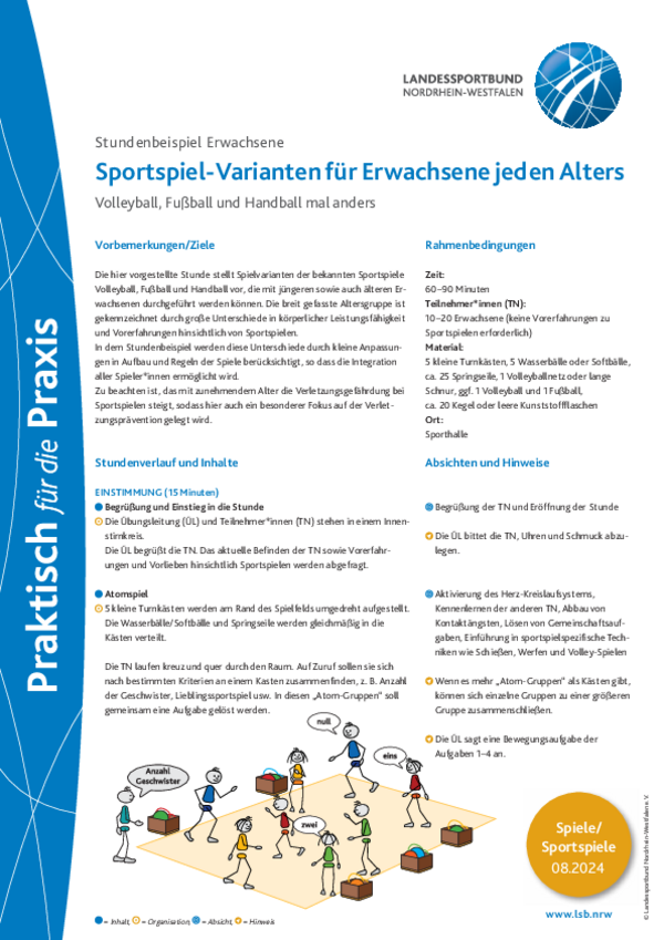 Die hier vorgestellte Stunde stellt Spielvarianten der bekannten Sportspiele Volleyball, Fußball und Handball vor, die mit jüngeren sowie auch älteren Erwachsenen durchgeführt werden können. In dem Stundenbeispiel werden diese Unterschiede durch kleine Anpassungen in Aufbau und Regeln der Spiele berücksichtigt, so dass die Integration aller Spieler*innen ermöglicht wird.