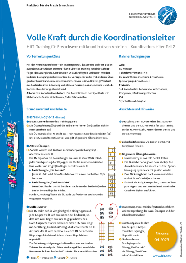 Mit der Koordinationsleiter – ein Trainingsgerät, das an eine auf dem Boden ausgelegte Strickleiter erinnert – kann über das Training variabler Schrittfolgen die Sprungkraft, Koordination und Schnelligkeit verbessert werden. In dieser Bewegungseinheit werden die Vorzüge der Leiter mit anderen Übungen kombiniert und so zu einem hochintensiven Intervalltraining (Wechsel aus hochintensiver Belastung und aktiven Pausen), das an, mit und durch die Koordinationsleiter gesteuert wird.