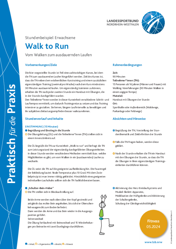 Die hier vorgestellte Stunde ist Teil eines achtwöchigen Kurses, bei dem die TN zum ausdauernden Laufen hingeführt werden. Ziel des Kurses ist, dass die TN neben dem wöchentlichen Kurstraining und einem zusätzlichen eigenständigen Training (zweimal pro Woche) nach dem Kurs mindestens 30 Minuten ausdauernd laufen. Um eigenständig trainieren zu können, erhalten die TN nach jeder zweiten Stunde ein Handout mit Übungen, die in der Stunde durchgeführt wurden.