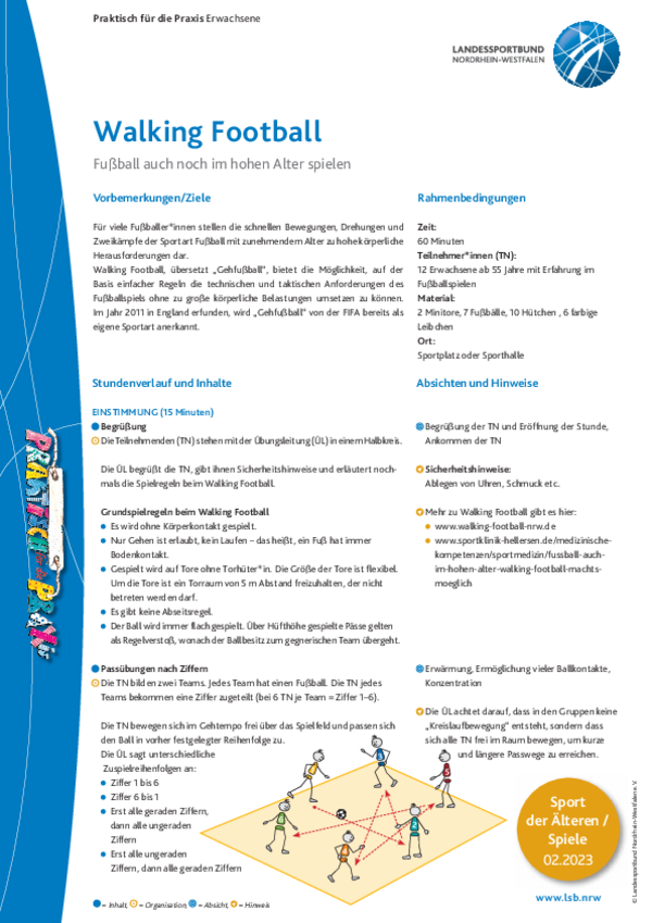 Walking Football, übersetzt „Gehfußball“, bietet die Möglichkeit, auf der Basis einfacher Regeln die technischen und taktischen Anforderungen des Fußballspiels ohne zu große körperliche Belastungen umsetzen zu können.