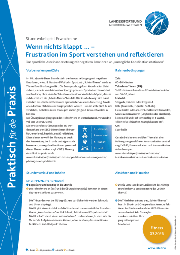 Im Mittelpunkt dieser Stunde steht der bewusste Umgang mit negativen Emotionen, wie z. B. Frust und Wut beim Sport. Als „Schein-Thema“ wird das Thema Koordination gewählt.