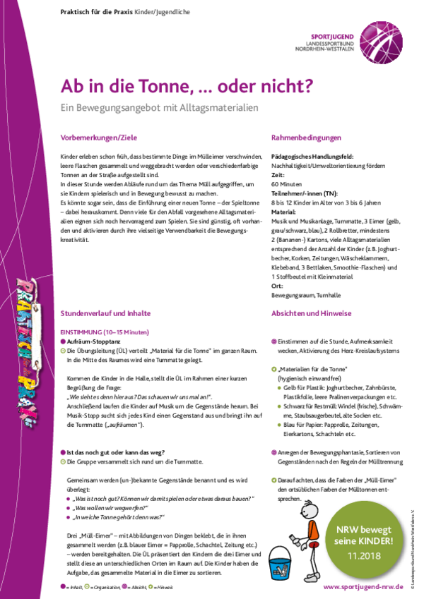In dieser Stunde werden Abläufe rund um das Thema Müll aufgegriffen, um sie Kindern spielerisch und in Bewegung bewusst zu machen. Es könnte sogar sein, dass die Einführung einer neuen Tonne – der Spieltonne – dabei herauskommt. Denn viele für den Abfall vorgesehene Alltagsmaterialien eignen sich noch hervorragend zum Spielen. Sie sind günstig, oft vorhanden und aktivieren durch ihre vielseitige Verwendbarkeit die Bewegungskreativität.