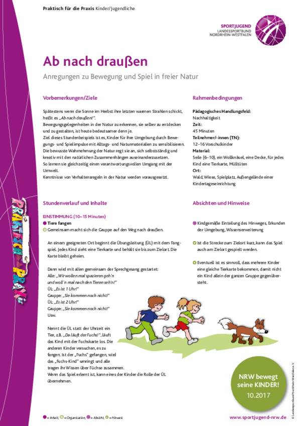 Ziel dieses Stundenbeispiels ist es, Kinder für ihre Umgebung durch Bewegungs- und Spielimpulse mit Alltags- und Naturmaterialien zu sensibilisieren. Die bewusste Wahrnehmung der Natur regt sie an, sich selbstständig und kreativ mit den natürlichen Zusammenhängen auseinanderzusetzen.