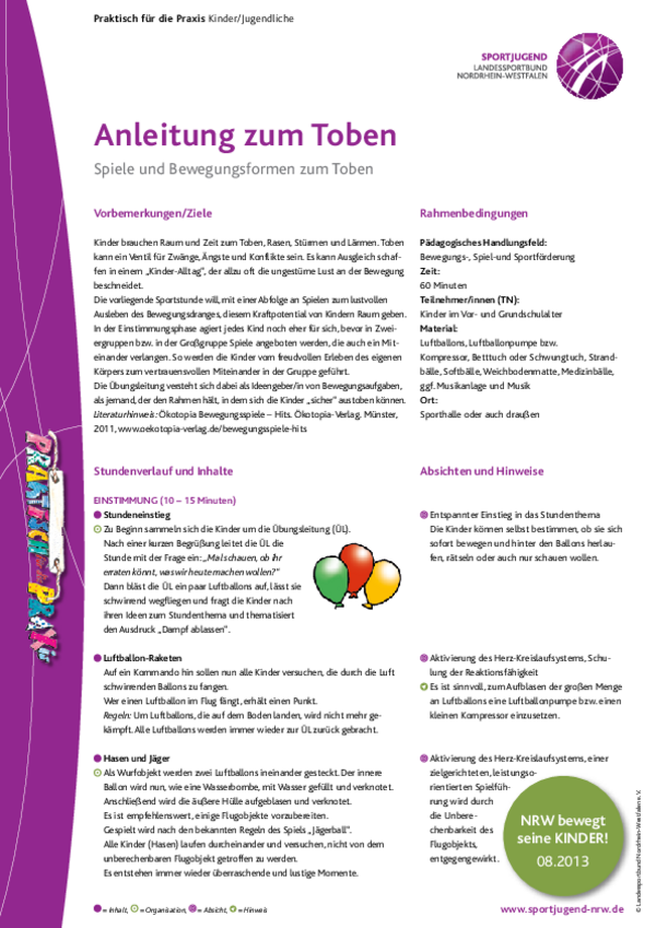 Kinder brauchen Raum und Zeit zum Toben, Rasen, Stürmen und Lärmen. Toben kann ein Ventil für Zwänge, Ängste und Konflikte sein. Es kann Ausgleich schaffen in einem „Kinder-Alltag“, der allzu oft die ungestüme Lust an der Bewegung beschneidet.
