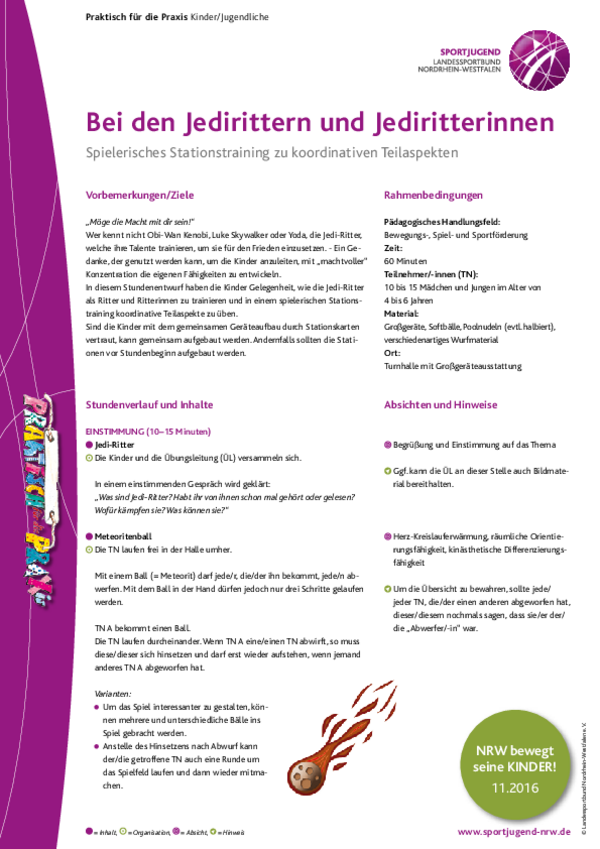 In diesem Stundenentwurf haben die Kinder Gelegenheit, wie die Jedi-Ritter als Ritter und Ritterinnen zu trainieren und in einem spielerischen Stationstraining koordinative Teilaspekte zu üben.