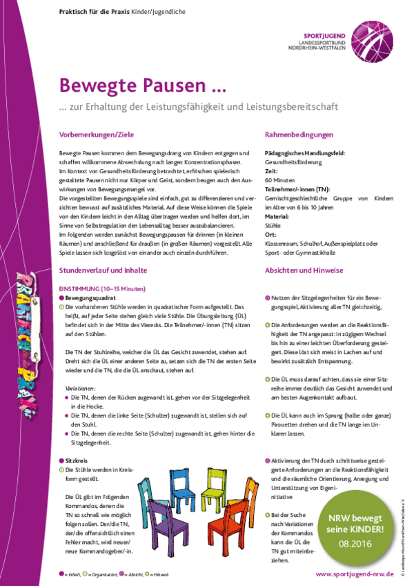 Im dem Stundenbeispiel werden zunächst Bewegungspausen für drinnen (in kleinen Räumen) und anschließend für draußen (in großen Räumen) vorgestellt. Alle Spiele lassen sich losgelöst von einander auch einzeln durchführen.