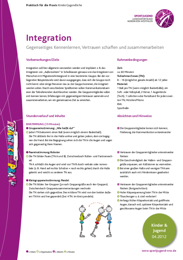 Integration soll hier allgemein verstanden werden und impliziert z. B. das Integrieren von „Außenseitern“ in Schulklassen genauso wie das Integrieren von Menschen mit Migrationshintergrund in eine bestimmte Gruppe.