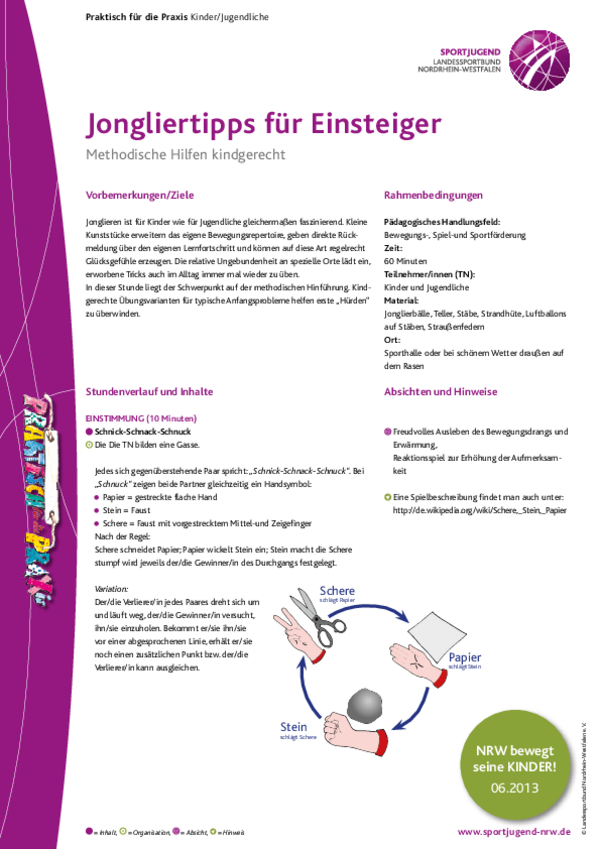 Jonglieren ist für Kinder wie für Jugendliche gleichermaßen faszinierend. Kleine Kunststücke erweitern das eigene Bewegungsrepertoire, geben direkte Rückmeldung über den eigenen Lernfortschritt und können auf diese Art regelrecht Glücksgefühle erzeugen.