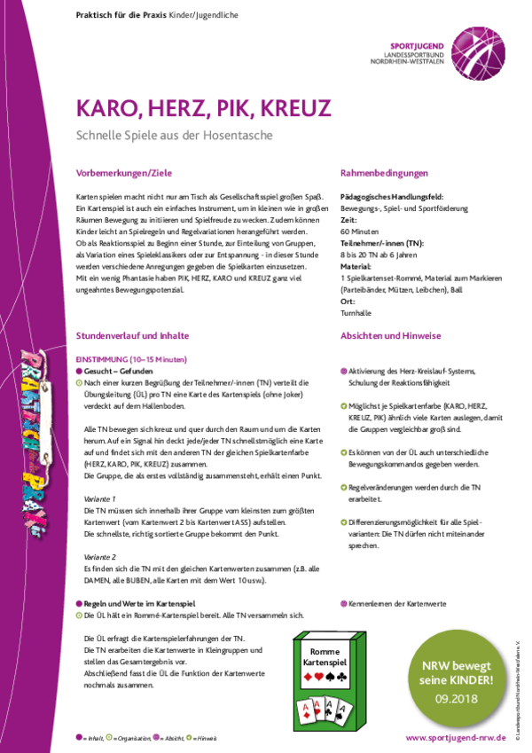 Ob als Reaktionsspiel zu Beginn einer Stunde, zur Einteilung von Gruppen, als Variation eines Spieleklassikers oder zur Entspannung - in dieser Stunde werden verschiedene Anregungen gegeben Spielkarten einzusetzen. Mit ein wenig Phantasie haben PIK, HERZ, KARO und KREUZ ganz viel ungeahntes Bewegungspotenzial.
