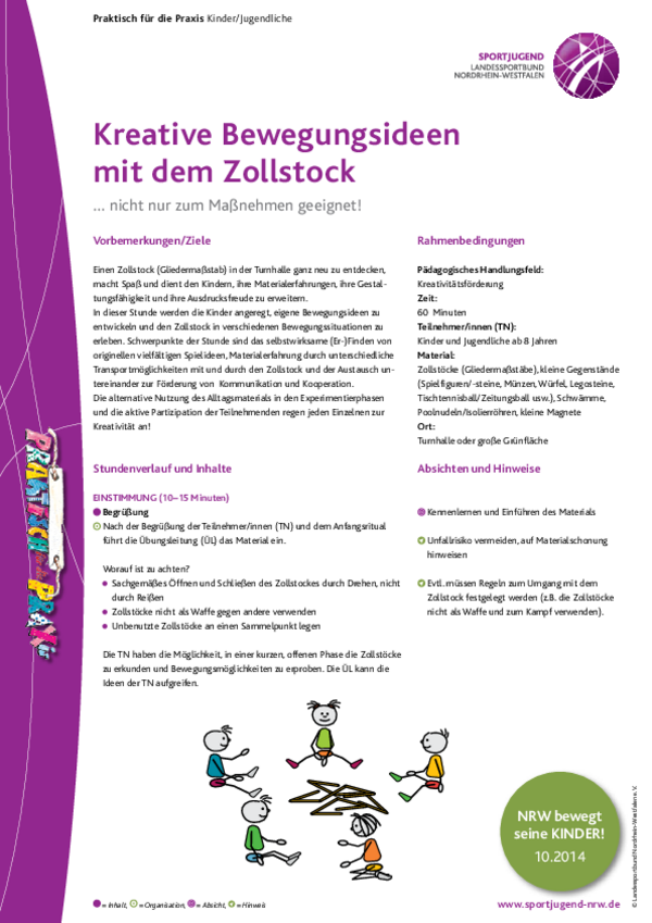 Einen Zollstock (Gliedermaßstab) in der Turnhalle ganz neu zu entdecken, macht Spaß und dient den Kindern, ihre Materialerfahrungen, ihre Gestaltungsfähigkeit und ihre Ausdrucksfreude zu erweitern. In dieser Stunde werden die Kinder angeregt, eigene Bewegungsideen zu entwickeln und den Zollstock in verschiedenen Bewegungssituationen zu erleben.