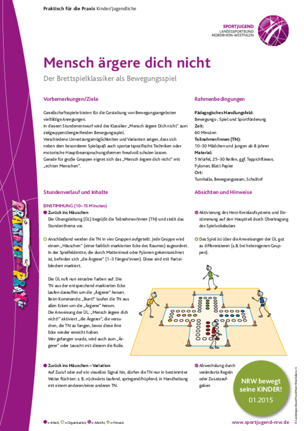 Gesellschaftsspiele bieten für die Gestaltung von Bewegungsangeboten vielfältige Anregungen. In diesem Stundenentwurf wird der Klassiker „Mensch ärgere Dich nicht“ zum zielgruppenübergreifenden Bewegungsspiel.