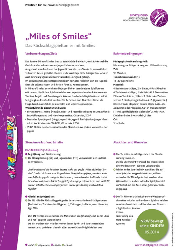 Das Turnier Miles of Smiles besitzt tatsächlich die Macht, ein Lächeln auf die Gesichter der teilnehmenden Jugendlichen zu zaubern. Ausgehend von den Ideen der Jugendlichen wird das Turnier in wesentlichen Teilen von ihnen gestaltet. Da sind nicht nur körperliche Fähigkeiten sondern auch Erfindungsgeist und Kommunikationsfähigkeit gefragt.