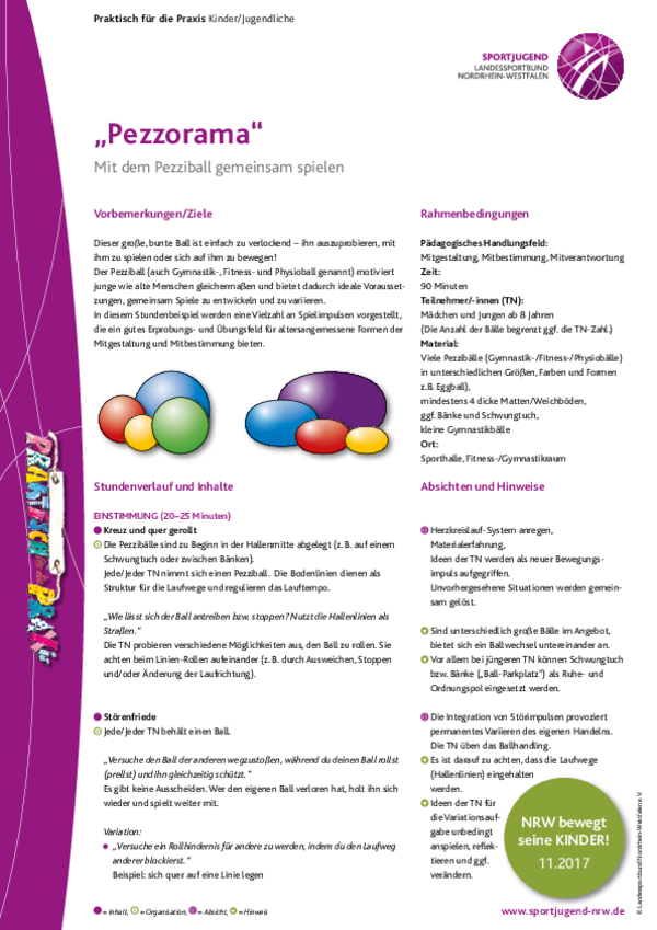 Dieser große, bunte Ball ist einfach zu verlockend – ihn auszuprobieren, mit ihm zu spielen oder sich auf ihm zu bewegen! Der Pezziball (auch Gymnastik-, Fitness- und Physioball genannt) motiviert junge wie alte Menschen gleichermaßen und bietet dadurch ideale Voraussetzungen, gemeinsam Spiele zu entwickeln und zu variieren.
