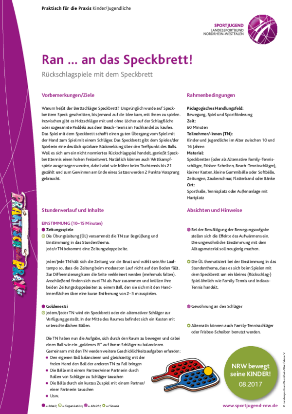 Das Spiel mit dem Speckbrett schafft einen guten Übergang vom Spiel mit der Hand zum Spiel mit einem Schläger. Das Speckbrett gibt dem Spieler/der Spielerin eine deutlich spürbare Rückmeldung über den Treffpunkt des Balls. Weil es sich um ein nicht normiertes Rückschlagspiel handelt, genießt Speckbretttennis einen hohen Freizeitwert.