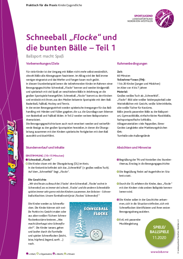 In diesem Stundenbeispiel lernen die teilnehmenden Kinder im Rahmen einer Bewegungsgeschichte Schneeball „Flocke“ kennen und werden kindgemäß und spielerisch mit viel Spaß an verschiedene Bälle in Anlehnung an die großen Sportspiele herangeführt. Schneeball „Flocke“ kommt zu den Kindern und entdeckt mit ihnen, aus den Medien bekannte Sportspiele mit dem Ball: Basketball, Fußball, Hockey und Tennis.