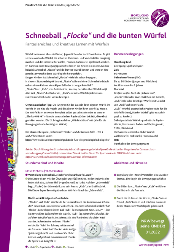 Würfel faszinieren alle – ob Kinder, Jugendliche oder auch Erwachsene. Es gibt so viele wertvolle Würfel, die schon im Kleinkind- und Vorschulalter neugierig machen und das Interesse für Zahlen, Formen, Farben etc. spielerisch wecken. Im Rahmen einer Bewegungsgeschichte lernen die Kinder in diesem Stundenbeispiel Schneeball „Flocke“ und die bunten Würfel kennen und werden kindgerecht an verschiedene Würfelspiele herangeführt.