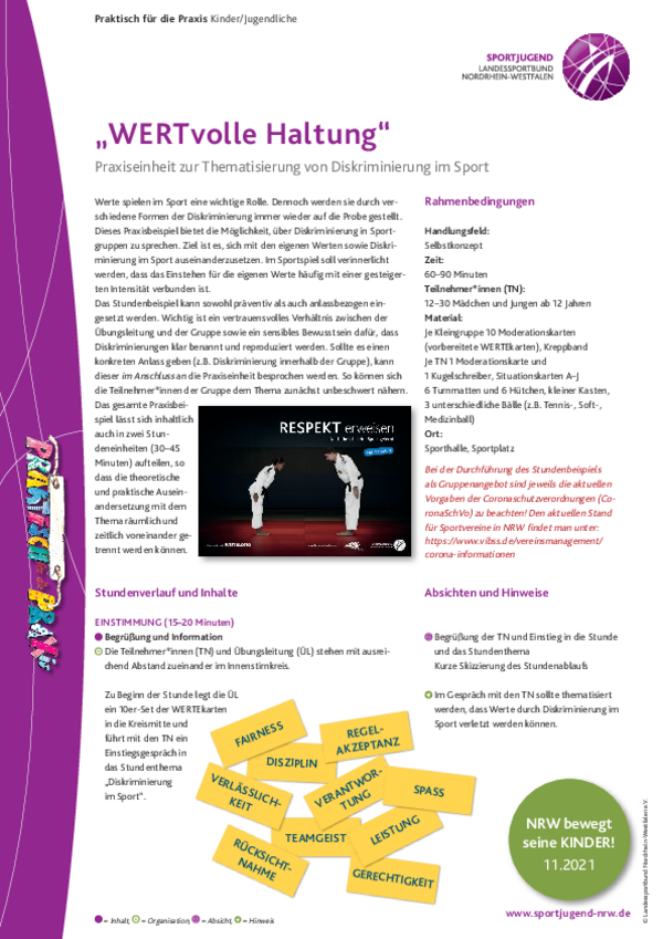 Dieses Praxisbeispiel bietet die Möglichkeit, über Diskriminierung in Sportgruppen zu sprechen. Ziel ist es, sich mit den eigenen Werten sowie Diskriminierung im Sport auseinanderzusetzen. Im Sportspiel soll verinnerlicht werden, dass das Einstehen für die eigenen Werte häufig mit einer gesteigerten Intensität verbunden ist.