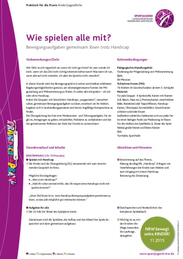 In dieser Stunde wird das Bewegungsspiel mit seinen unmittelbar erlebbaren Regelungsmöglichkeiten genutzt, um altersangemessene Formen der Mitgestaltung und Mitbestimmung zu finden. Es sollen alle mitspielen – ob mit oder ohne Handicap.