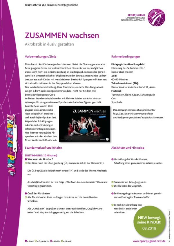 In diesem Stundenbeispiel werden mit kleinen Spielen zunächst Voraussetzungen für das gemeinsame Erproben akrobatischer Figuren geschult. Anschließend wird in Kleingruppen eine akrobatische Figur beispielhaft erarbeitet und abschließend präsentiert. Körperliche Schädigungen oder Sinnesbehinderungen erfordern Hintergrundwissen. Hier können vertrauliche Absprachen mit den Kindern bzw. Eltern im Vorfeld hilfreich sein.