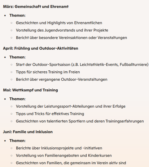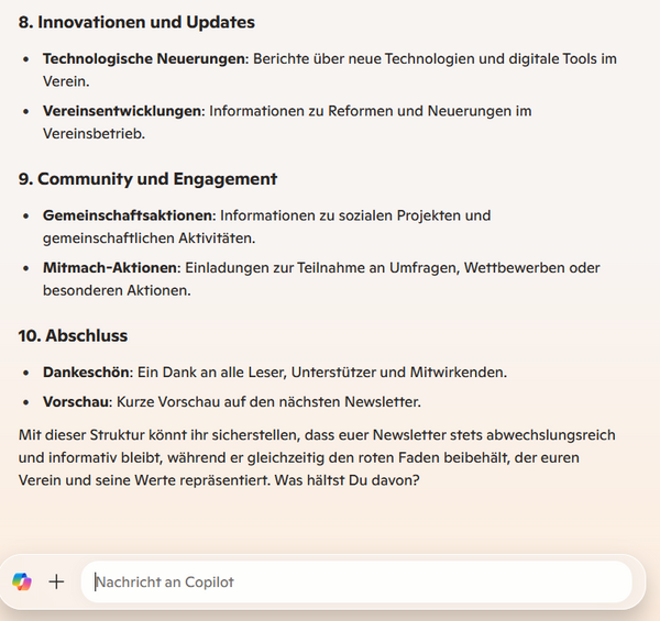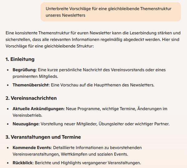 Künstliche Intelligenz (hier: Microsoft Copilot) hilft bei der Themenauswahl/Ideenfindung eines Vereins-Newsletters passend zum Vereins-Leitbild. Das Leitbild wurde der Künstlichen Intelligenz zuvor per Prompt bereitgestellt. Nach erfolgter Themenauswahl/Ideenfindung wird die KI aufgefordert, eine gleichbleibende Themenstruktur vorzuschlagen.